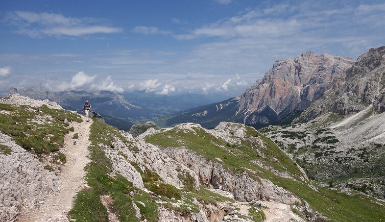 Kurz, aber nicht zu unterschätzen ist diese kleine Gipfeltour auf den 2.477 m hohen Sas de Stria - den Hexenstein über den Pässen von Valparola und Falzarego. Der Parkplatz bei der Valparola-Passhöhe, gleich nach dem Kriegsmuseum Forte Tre Sassi, ist Ausgangspunkt der Tour. Wir folgen dem Wegweiser "Sas de Stria". Der Steig zieht sich durch felsiges Gelände auf rund einem Kilometer Strecke etwa 290 Höhenmeter nach oben. Die nur für erfahrene Bergwanderer geeignete Route folgt einem alten Pfad aus Kriegszeiten. An einigen Stellen sind Befestigungen (Leitern, Stahlseile) zum leichteren Vorankommen angebracht.