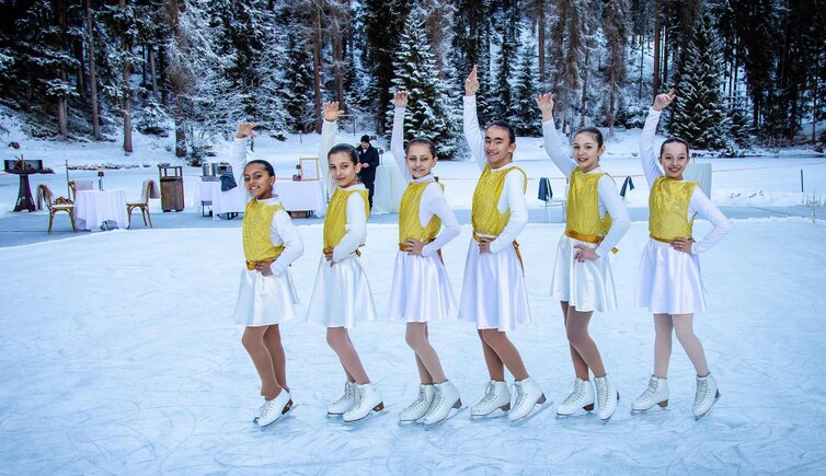 Lake Sompunt transforms into a unique event that blends elegance and tradition in an enchanting atmosphere. Its frozen surface becomes a sophisticated open-air venue, with ice performances by the athletes of the Ice Club Alta Badia and sommeliers on skates, who guide you through winter-inspired drinks and delicacies offered by local chefs.