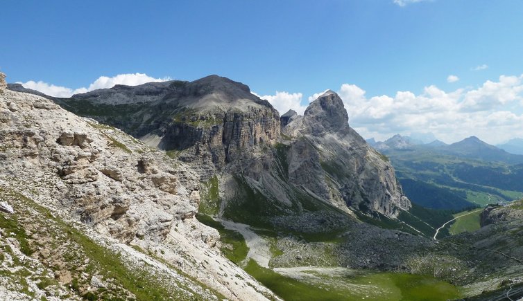 The tour starts at the Colfosco high-rope course and leads first to the Rif. Edelweiss mountain hut at 1,824 m a.s.l. Afterwards the path snakes its way to the Forcella del Sassongher wind gap and further on - on a relatively easy fixed-rope route - to the summit. The wind gap, however, can also be reached via the Rif. Col Pradat (Corvara), Rif. Puez or Rif. Gardenacia (La Villa) mountain huts.
