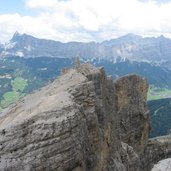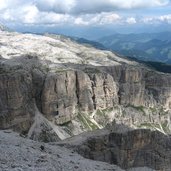 At 2,100 m a.s.l. the path to Mt. Sassongher branches off on the right. On this path we traverse underneath a rock face. On the opposite, there is the Sella Group with the Val Mezdí valley, known among freeriders. Be careful and watch out for your steps! At 2,435 m a.s.l. we reach the Forcella del Sassongher ridge, where an easy fixed-rope route starts, including also a section with huge steps. Experienced mountaineers don't need any securing devices, for others it is absolutely advisable. Here you also need your hands. In high season (especially August) there might also be jams in this place.