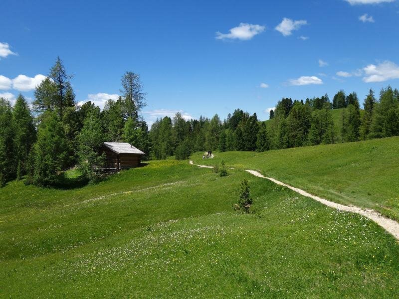 Our hike starts in Badia, where we first walk from the valley station of the Santa Croce Chair Lift through the centre of San Leonardo and then follow the marker “Roda de Armentara” (no. 7A). The asphalt road is soon replaced by a forest road. Past farms we walk through the forest and reach the meadows of Cialaruns at 1,600 m a.s.l. There the path starts which leads across the wide flower meadows of Pre Comun to the higher located alpine pastures of Armentara. Here the scenic beauty of the Fanes Group, which forms the backdrop to the landscape, is combined with the species-rich meadows that belong to the Fanes-Senes-Braies nature reserve. At about 1,800 m a.s.l. we reach the Ranch d Andre’ mountain hut at the edge of the forest, which is famous for its good cuisine.