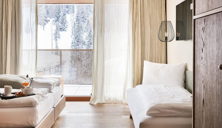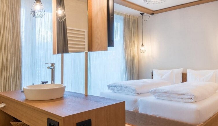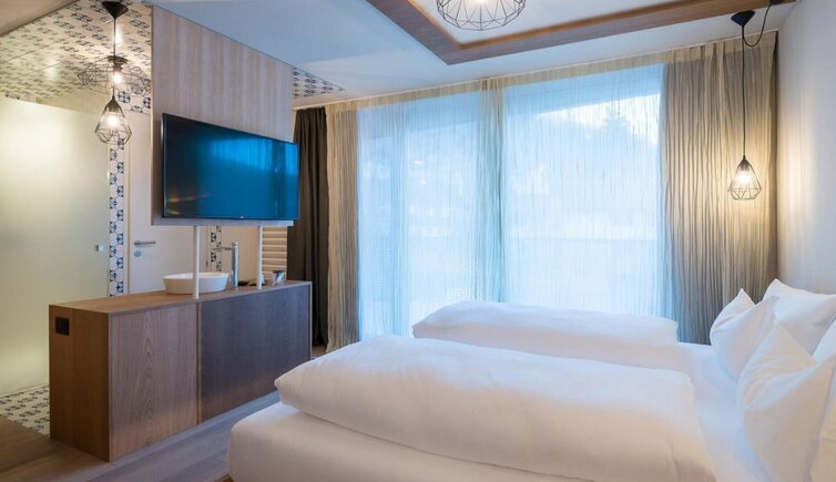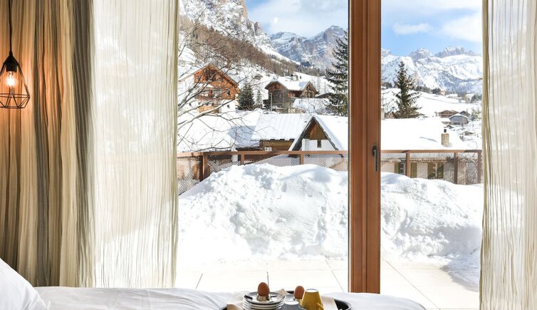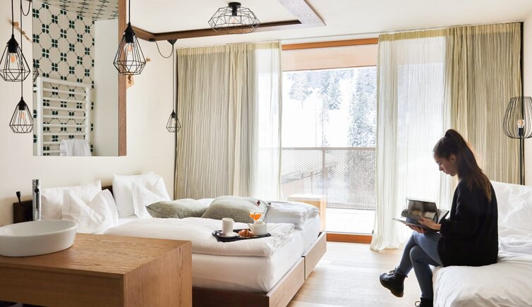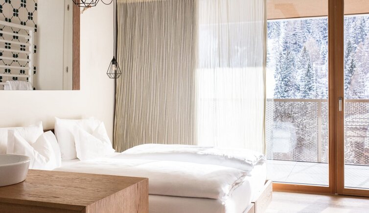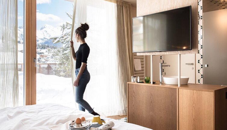 L’hotel, in stile contemporaneo, riflette le frastagliate vette dei dintorni. Ogni camera dispone di ampie finestre panoramiche che, insieme ai mobili e ai caldi pavimenti in legno, invitano a soffermarsi e rallentare il ritmo.