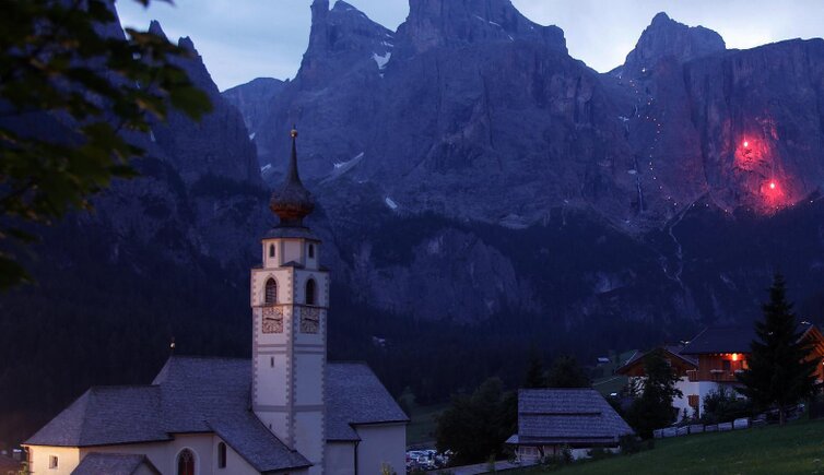 Vieni ad ammirare questo spettacolo nella piazzetta della chiesa a Colfosco, il miglior punto da cui ammirare l'illuminazione. Qui, la banda musicale di Colfosco-Corvara renderà l'evento ancora più suggestivo con le loro melodie incantevoli.
